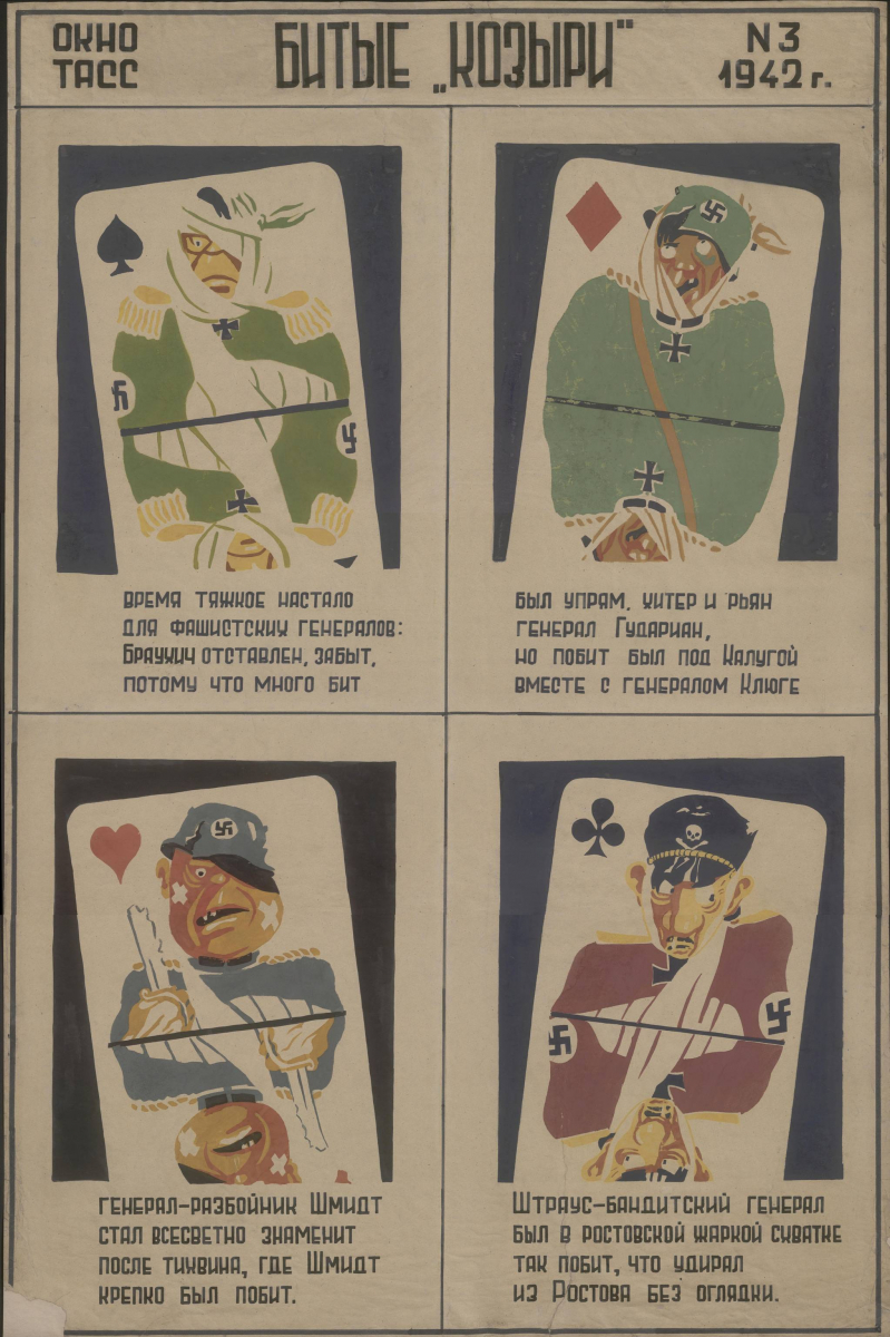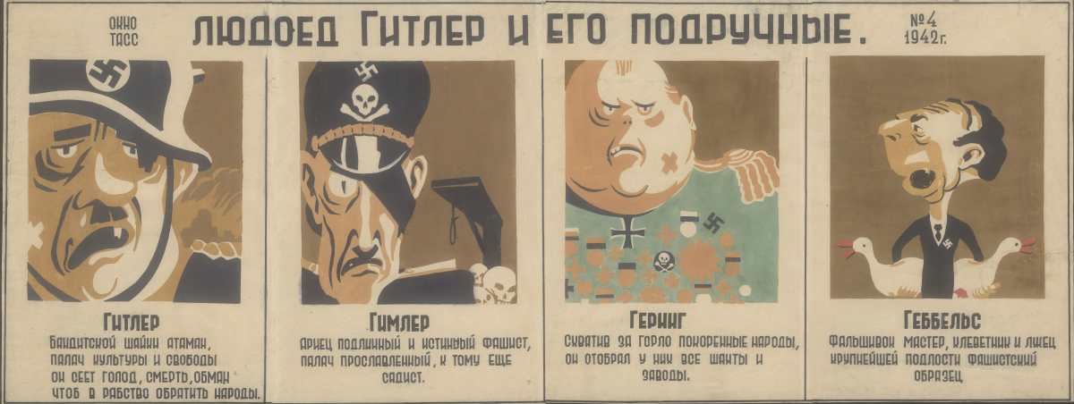 «Окна ТАСС» всегда тяготели к жанру сатиры, поэтому основной задачей томских плакатистов стало высмеивание германской военной и политической верхушки, а также разоблачение бесчинств фашистских войск. Первые выпуски имели характерные названия: «Битые “козыри”», «Людоед Гитлер и его подручные», «Гитлеровская грабь-армия» и т.п. Немало сатирических сюжетов было создано и на тему взаимоотношений между странами фашистской «Оси».