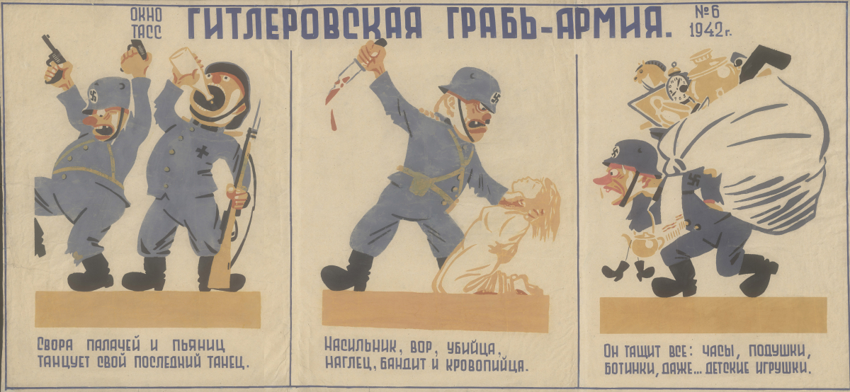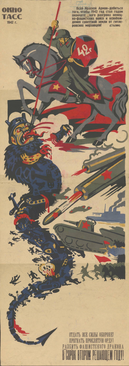 Вместе с тем значительное место в «Окнах» занимал образ положительного героя – в лице воина Красной Армии, партизана или труженика тыла. Особенностью произведений томской мастерской стало повышенное внимание к тыловой тематике: человек труда либо передавал снаряды или теплые вещи бойцу на фронте, либо непосредственно разил врага результатами своей ударной работы, как, например, в плакате «Больше металла – ближе победа!» (1943). Особняком стоят сюжеты, восходящие к исторической и культурной памяти народа. В частности, на одном из плакатов советский солдат, восседающий на коне и поражающий копьем змееподобное существо, которое символизирует фашизм, весьма определенно напоминает сакральный образ Георгия Победоносца. На другом гитлеровские сателлиты предстали в виде персонажей классических басен И. Крылова.
