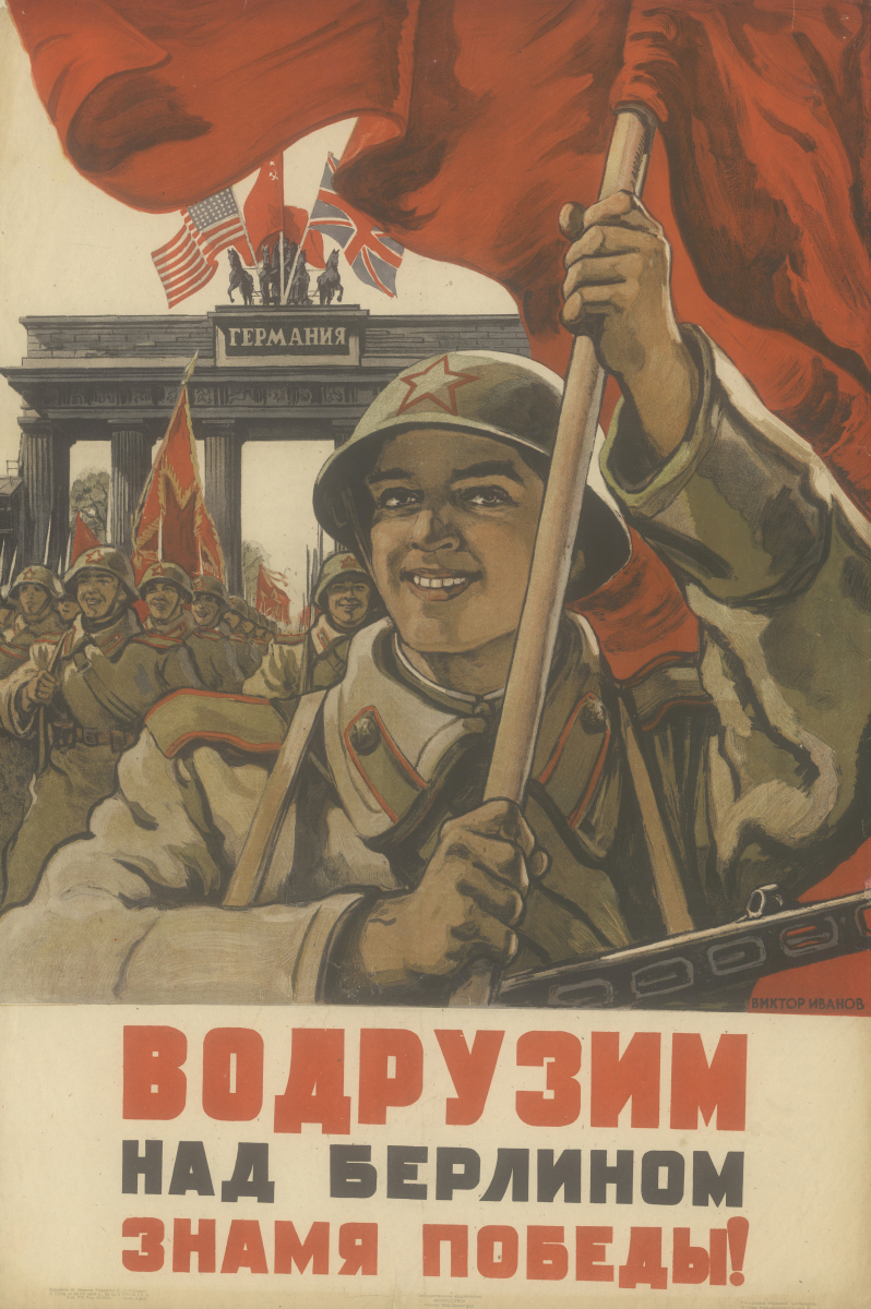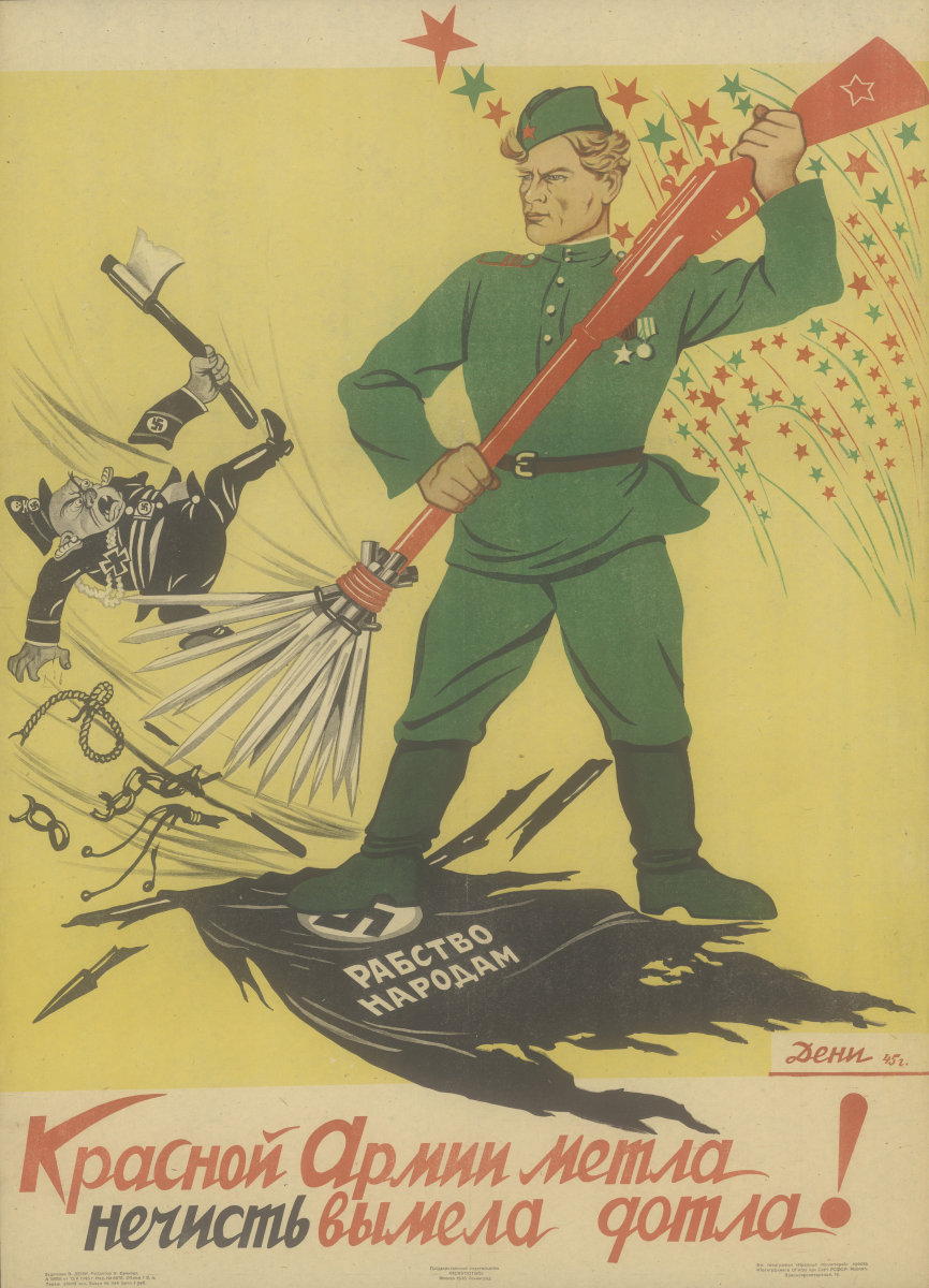 Агитационные и сатирические плакаты наполняли фронтовую и тыловую жизнь советских людей настроением патриотизма и стойкости. В самые тяжелые периоды войны, пробуждая чувства и мысли о славном прошлом, суровом настоящем и светлом будущем, они были проникнуты верой в разгром врага. Так, сюжет выпущенного в конце декабря 1944 г. плаката В. Иванова «Водрузим над Берлином знамя победы!» пророчески изображал марш советских войск по улицам германской столицы. А итог войны подведён в агитке художника-сатирика В. Дени, которая вышла в свет спустя три дня после долгожданной победы, возвестив шутливо-праздничным лозунгом: «Красной Армии метла нечисть вымела дотла!».