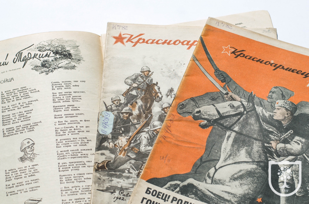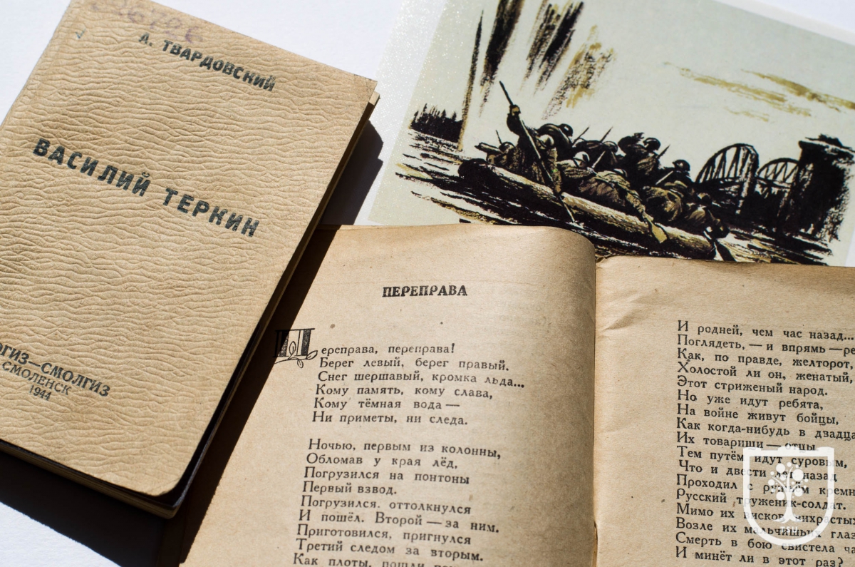 В рамках выставки представлены одна из первых публикаций «Василия Тёркина» в журналах «Красноармеец» (август-сентябрь, 1942) и «Знамя» (сентябрь, 1942), а также московское, чкаловское и смоленское издания. Все они поступили в Научную библиотеку Томского университета в период войны и в первый послевоенный год. Выставка проиллюстрирована репродукциями рисунков О.Г. Верейского.