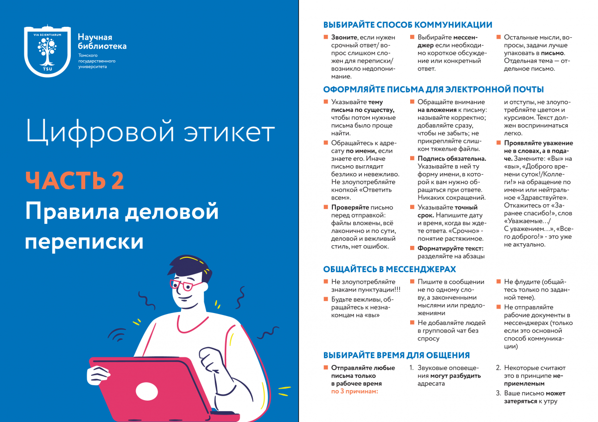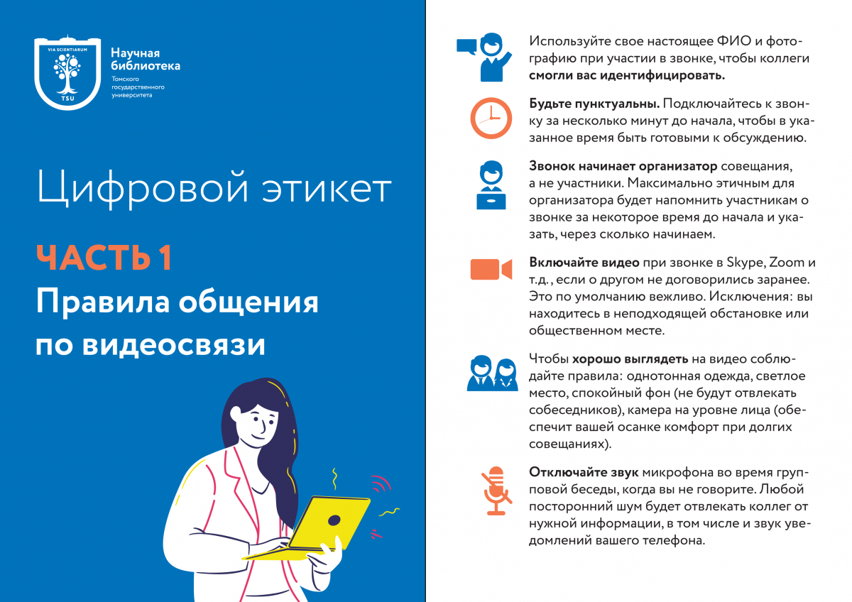 Сотрудники отдела обслуживания и отдела библиотечного взаимодействия и технологии Научной библиотеки ТГУ подготовили серию чек-листов, посвященную цифровому этикету. На основе большого опыта участия в онлайн-мероприятиях и электронной переписке non-stop, были собраны актуальные правила поведения и сформированы по направлениям: «Правила деловой переписки», «Общение по видеосвязи», «Важно знать». Чек-листы можно использовать для оценки своего цифрового этикета, отмечая по пунктам «Все ли я делаю правильно?», и как полезный информационный материал.