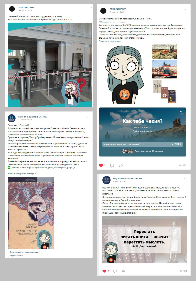 В декабре 2019 года команда «Мюсли Канта» Научной библиотеки ОмГУПС создала для групп ВКонтакте онлайн-проект «Польза Почитаева». Был разработан яркий персонаж, воплотивший любовь к чтению, путешествиям, походам в музеи и театры. Персонаж создавался с учетом личностных особенностей студентов, которые сотрудничают с культурно-образовательным пространством ОмГУПС «Мюсли Канта». В результате появился маскот по имени Польза Почитаева: синеволосая девушка, олицетворяющая активного, творческого, креативного студента. Был разработан бренд-бук, включающий в себя различные варианты изображений маскота, макеты футболок и кружек.