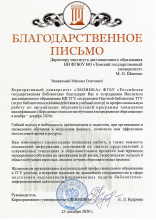 Корпоративный университет «Ленинка» ФГБУ «Российская государственная библиотека», ставший одним из участников обучения, направил благодарственное письмо в адрес организаторов программы повышения квалификации, отметив превосходную командную работу, а также важность подаваемой информации, основанной на синтезе представлений о современных тенденциях в образовательном процессе как процессе непрерывного обучения на протяжении всей жизни.