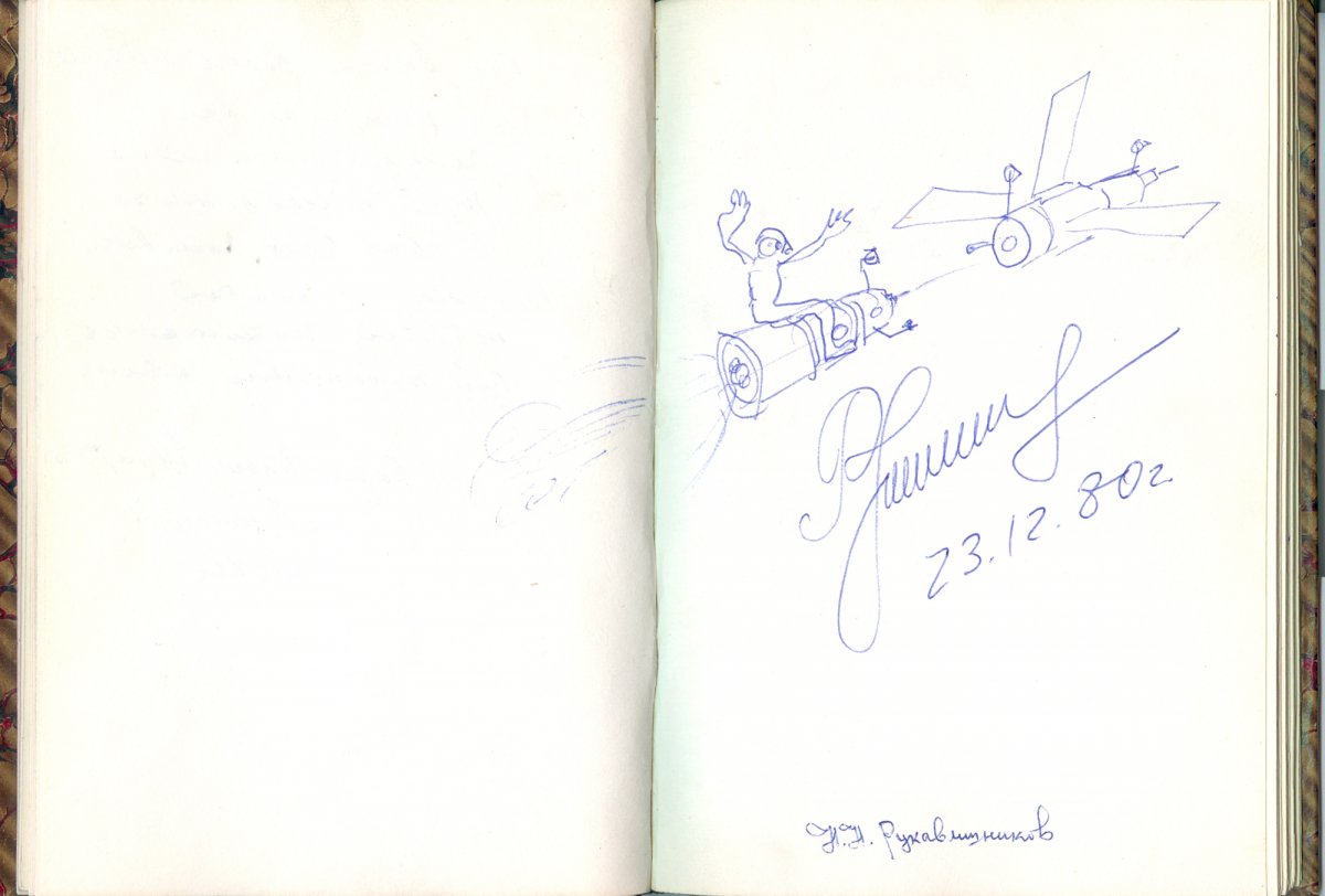 В записи, оставленной Н.Н. Рукавишниковым в Книге почётных посетителей, он признаётся, что увиденное буквально поразило его воображение, и называет библиотеку «могучим инструментом познания истории и науки». Во время экскурсии заведующий отделом редких книг и рукописей Василий Лобанов попросил космонавта оставить автограф в специально изготовленной им для подобных целей книжечке. Юмористический рисунок Николая Рукавишникова теперь бережно хранится в библиотеке.