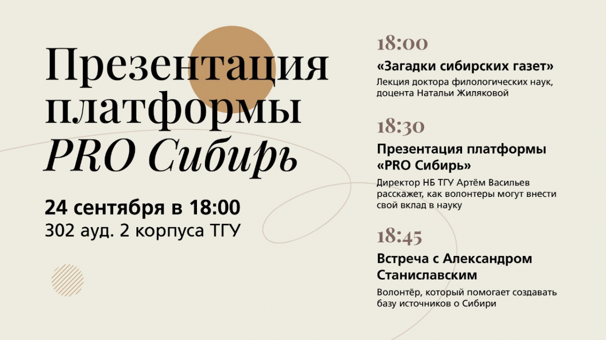 18:30 – презентация платформы «PRO Сибирь». Директор Научной библиотеки ТГУ Артем Васильев представит возможности, как волонтеры могут помочь платформе развиваться – улучшать базу данных, распознавать источники.
