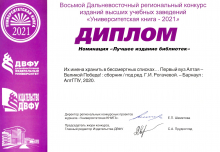 Научно-педагогическая библиотека Алтайского государственного педагогического университета (НПБ АлтГПУ) получила диплом в номинации «Лучшее издание библиотек» за сборник материалов «Их имена хранить в бессмертных списках… Первый вуз Алтая - Великой Победе!» по итогам VIII Дальневосточного регионального конкурса изданий для высших учебных заведений «Университетская книга – 2021». Издание посвящено памяти участников Великой Отечественной войны, студентов, преподавателей и сотрудников Барнаульского государственного педагогического института.
