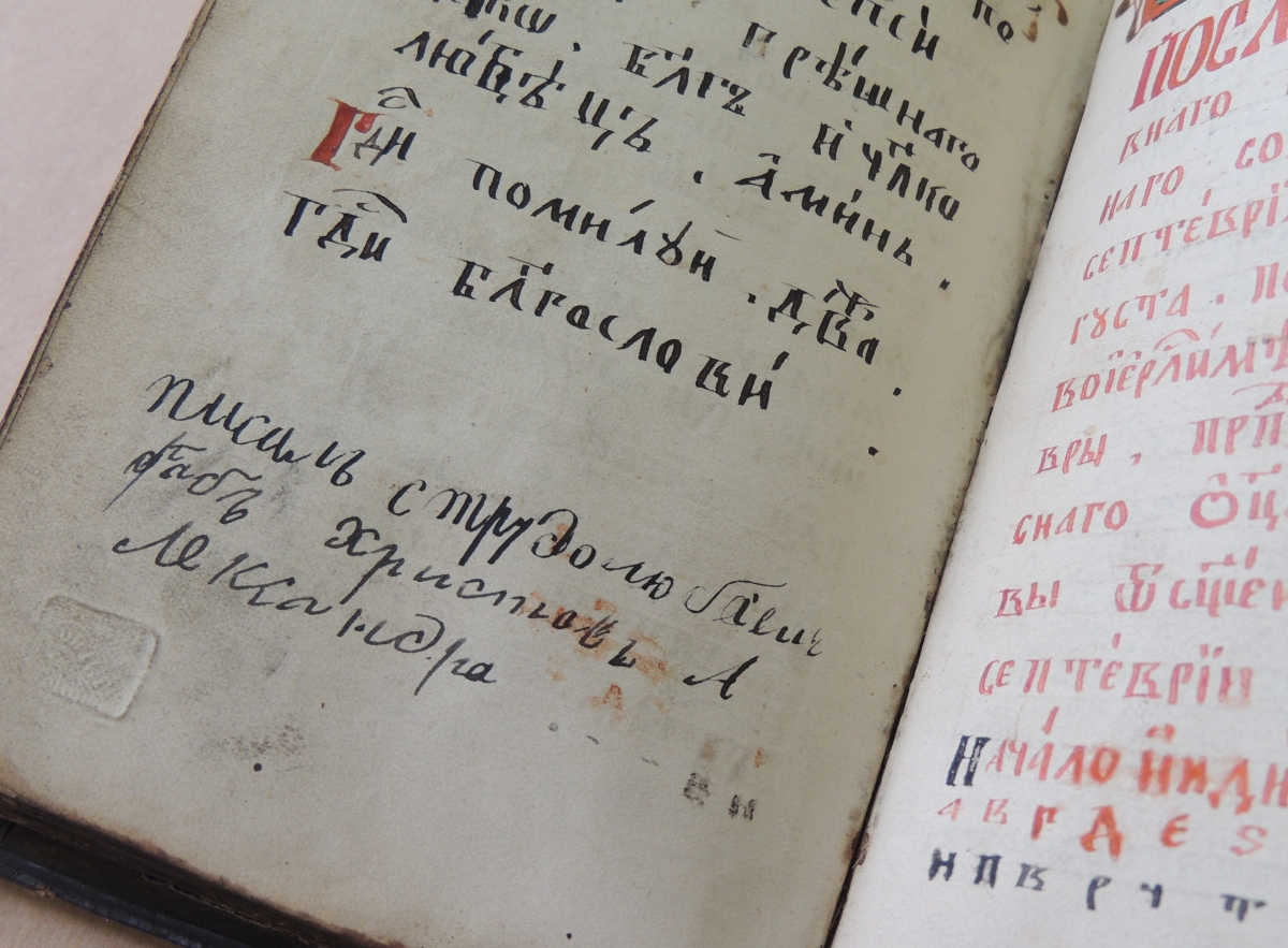 Писцовые записи показывают нам также и изменение восприятия писцом самого себя. Во всех записях он называет себя Александрой, однако в более ранних рукописях имеется ряд затертых или замытых записей, где местами можно прочесть и другое имя – Николай Иванов. В самой ранней рукописи он называет себя также Александрой Ивановым. Скорее всего, это один и тот же человек, только имя Николай Иванов (где Иванов – скорее всего, отчество) он носил до принятия крещения, в крещении же был назван Александро
