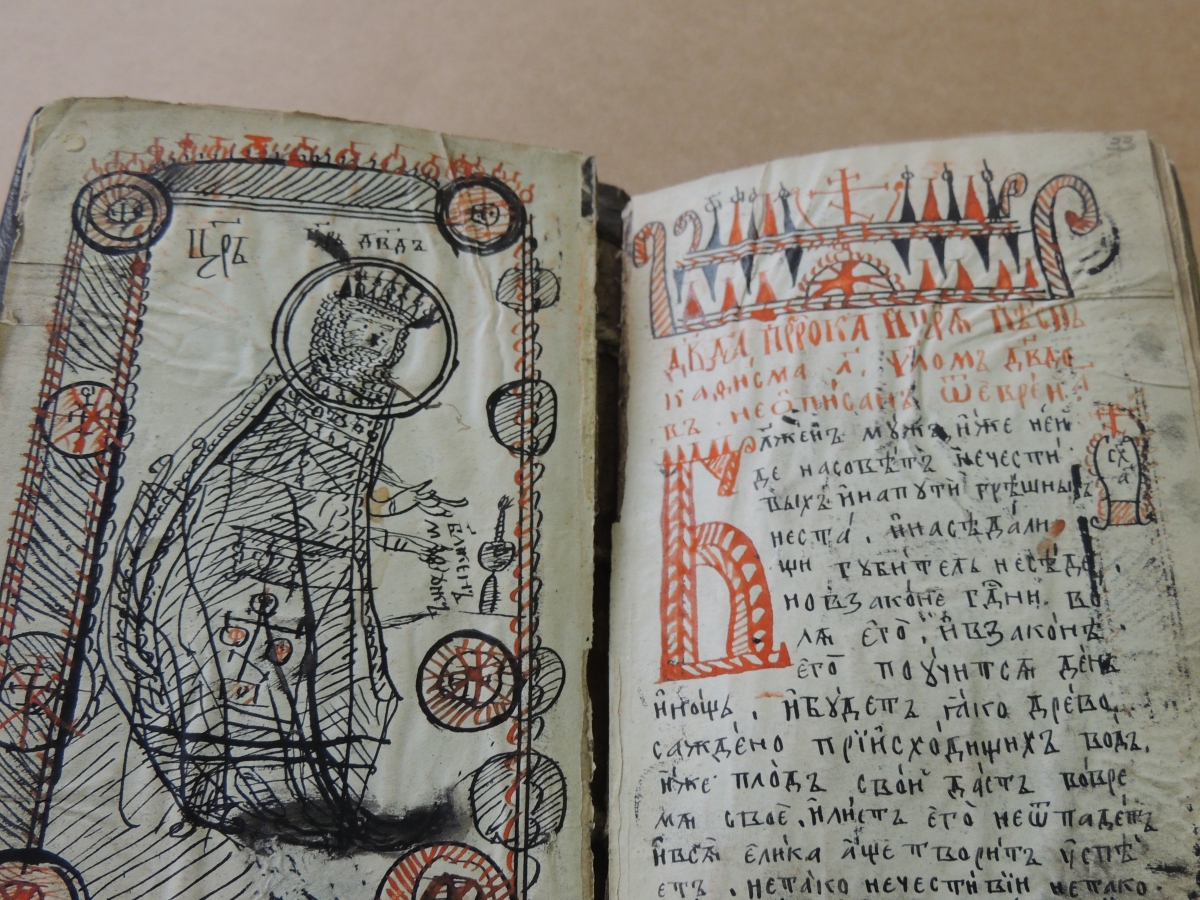 Внешний вид рукописей позволяет нам заглянуть в мастерскую писца-старообрядца. Во всех рукописях имеется очень характерная орнаментика: это заставки, выполненные не слишком умелой рукой, геометрического рисунка, обычно в две краски: черную и оранжевую. Единственная миниатюра, имеющаяся в рукописях, – это изображение царя Давида в Псалтири. Миниатюра выполнена пером, также в две краски. Почерк в самой ранней рукописи более аккуратен, но со временем становится более небрежным и размашистым.