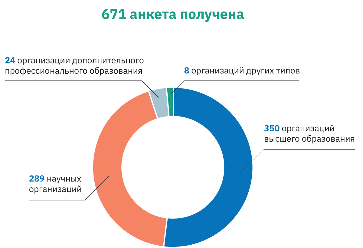В анкетировании приняли участие 350 организаций высшего образования, 289 научных организаций, 24 организации дополнительного профессионального образования, 8 организаций других типов. В числе организаций других типов – Санкт-Петербургская клиническая больница Российской академии наук и Федеральный центр строительного контроля.