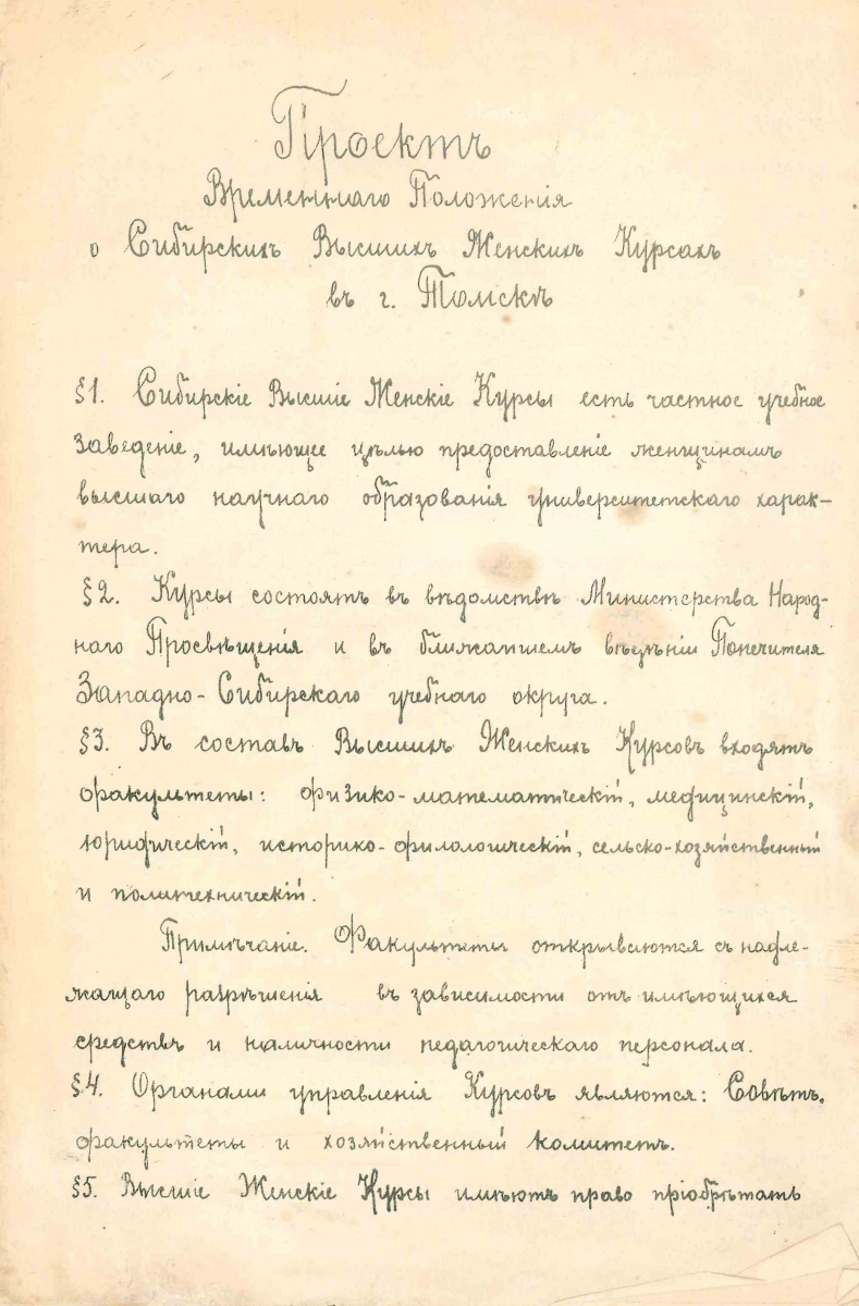 Литографированное издание проекта сохранилось в фонде НБ ТГУ. Заметны некоторые отличия от итогового текста, опубликованного позднее, что говорит о его последующей редакции. Положение о курсах было утверждено попечителем Западно-Сибирского учебного округа Леонидом Ивановичем Лаврентьевым, который «находил желательным открытие в Томске высшего женского учебного заведения». 21 августа 1910 года от него было получено разрешение Обществу открыть в Томске «частные Сибирские высшие женские курсы». Затем началась организационная работа по подготовке к началу деятельности курсов, выборам директора – им стал профессор Аркадий Валерианович Лаврский, набору слушательниц. 26 октября 1910 года в торжественной обстановке курсы были открыты.