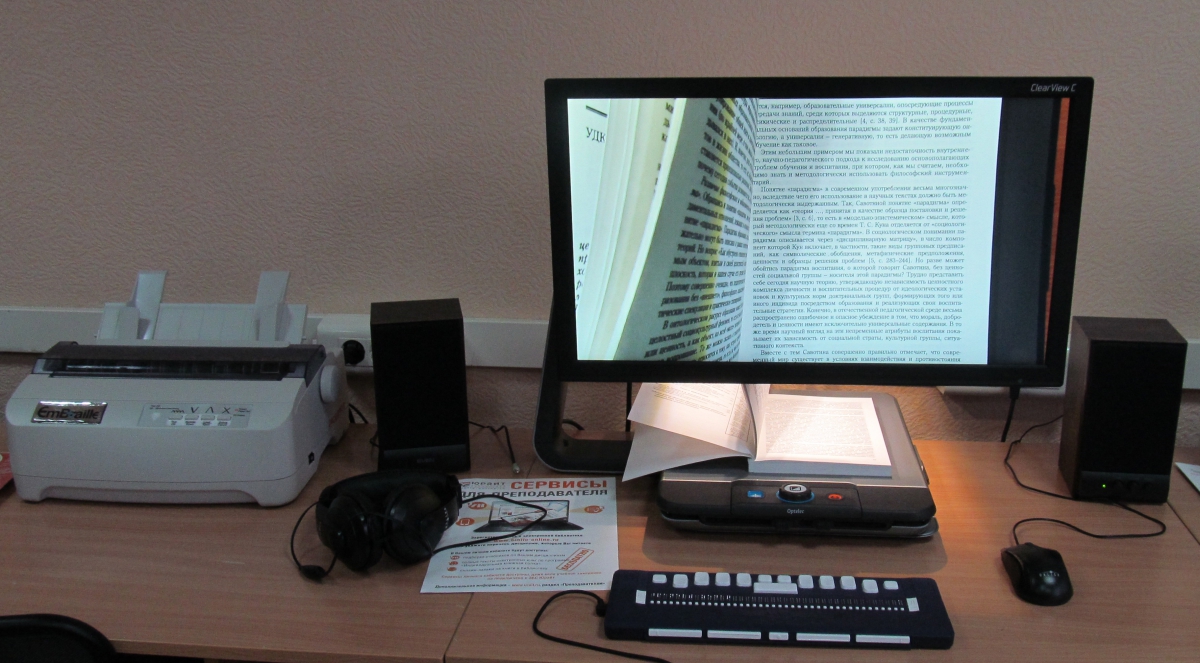 В новом учебном году в целях обеспечения условий для обучения лиц с ОВЗ читальные залы Научно-педагогической библиотеки Алтайского государственного педагогического университета оборудованы несколькими компьютерами для лиц с нарушениями опорно-двигательного аппарата и слабовидящих. Данные компьютеры оснащены специальным программным обеспечением, монитором с видеоувеличителем, новейшим дисплеем Брайля и принтером с рельефно-точечной печатью шрифтом Брайля.