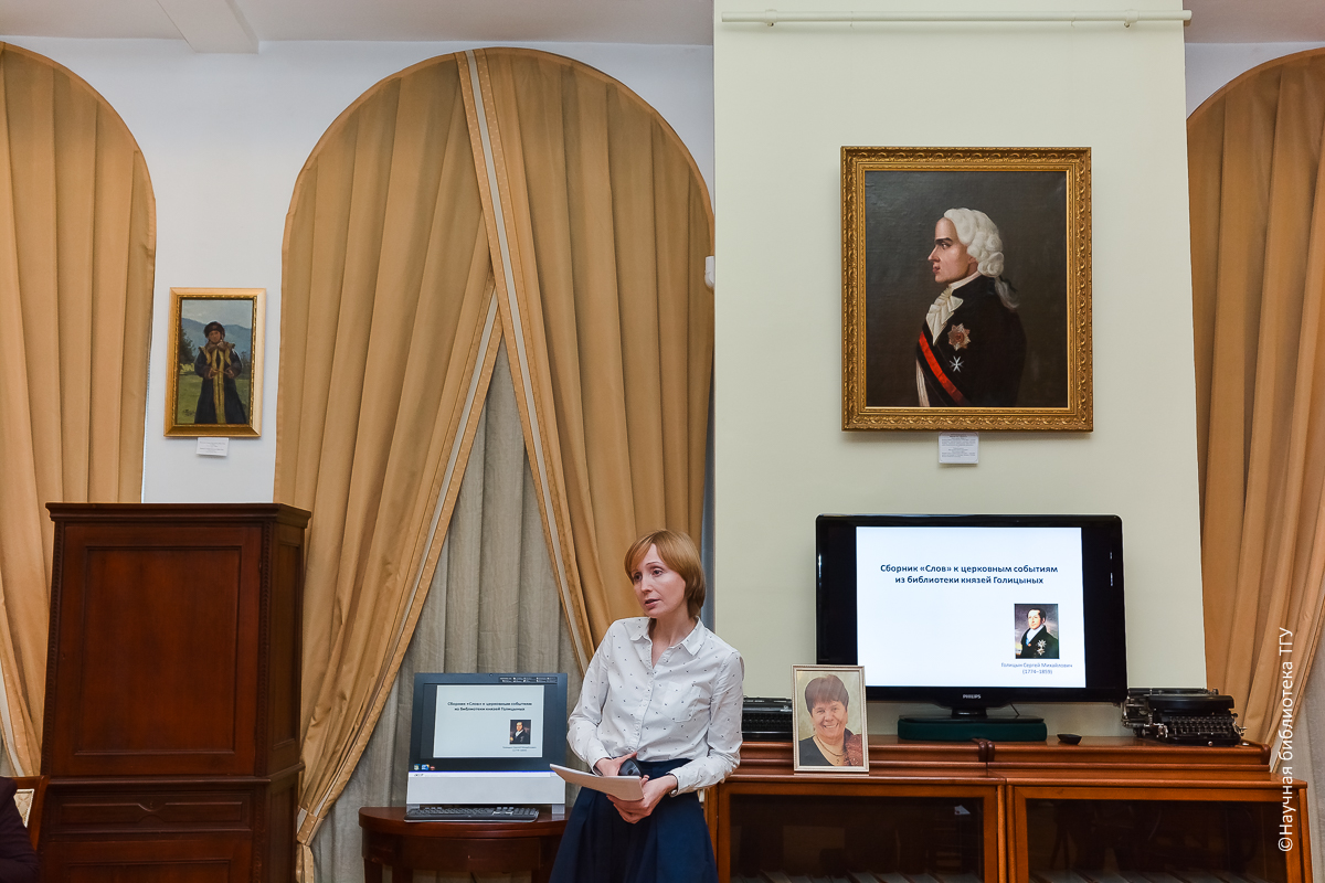 На заседании секции «Христианские ценности в русской литературе» заведующая сектором отдела рукописей и книжных памятников, кандидат филологических наук Наталья Гончарова представила доклад «Сборник «Слов» к церковным событиям из библиотеки С.М. Голицына», в котором рассказала о необычной книге из фондов Научной библиотеки. Это конволют (сборник, составленный из различных самостоятельных изданий), сформированный Голицыным из «Слов», «говоренных» духовными лицами по случаю праздников и событий церковной жизни, а также дней рождения императорских особ. Наталья Владимировна отметила, что анализ состава сборника, авторства и хронологии «Слов», событий, которым они посвящены, позволяет конкретизировать ценностные ориентиры и личностные черты составителя, подтвердить факты его дружеских взаимоотношений с настоятелями Донского монастыря, который для «последнего московского вельможи» был местом духовной жизни и связью с преданиями рода.