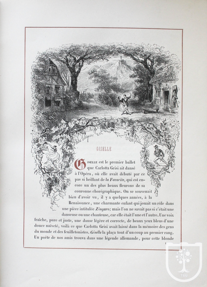 «Примадонны театра Оперἀ, или Шедевры музыкального театра в иллюстрациях» – одна из самых красивых книг, созданных в эпоху французского романтизма. Она представляет собой сборник, в котором собраны рецензии на спектакли, составившие славу главного музыкального театра Франции в тридцатые-сороковые годы XIX века. Авторами рецензий стали известные театральные критики и литераторы Теофиль Готье (Théophile Gautier, 1811-1872), Жюль Жанен (Jules Janin, 1804-1874) и Филарет Шаль (Philarète Chasles, 1798-1873). Предваряет сборник статья, посвящённая истории становления оперного искусства в Италии и Франции (автор Филарет Шаль). Книга увидела свет в Париже в 1845 г. в кооперативной типографии Жана Батиста Ксавье Лакрампа (Lacrampe, 1785-1851). Каждая рецензия в книге сопровождается многочисленными иллюстрациями в технике тоновой гравюры, широко вошедшей в практику книгопечатания в середине XIX века. Многофигурные композиции органично вплетаются в текст, раскрывая сюжет, и вместе составляют гармоничное целое. Изюминку оформления, её оригинальную черту составили цветные декоративные рамки, разработанные специально для каждой статьи и не повторяющиеся от выпуска к выпуску. В сложном фантазийном узоре обрамления просматриваются персонажи и целые сцены балета, либо оперы. Названия произведений напечатаны в два цвета: черным и красным, чёрным и зелёным, чёрным и лиловым. Каждый выпуск дополнен портретом исполнительницы заглавной роли, отпечатанным на отдельном листе.