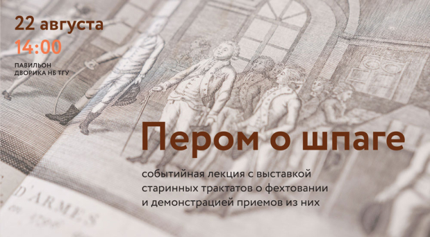 22 августа в 14:00 в павильоне дворика Научной библиотеки Томского государственного университета (ТГУ) пройдет событийная лекция «Пером о шпаге» с выставкой старинных трактатов о фехтовании и демонстрацией приемов из них. На выставке будут представлены книги о фехтовании XVII – XVIII веков из фонда Научной библиотеки ТГУ и личной коллекции Виктора Лобанова.