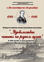 28 сентября в 14.00 ч. в выставочном зале Научной библиотеки (второй этаж старого здания) состоится открытие выставки «…Удовольствие читать на родном языке», посвященная 250-летию со дня рождения российского писателя, журналиста, переводчика, историографа Николая Михайловича Карамзина (1766-1826 гг.). На выставке представлены прижизненные издания и публикации его произведений, среди которых знаменитая «История государства Российского» (1816-1826 гг.), «Письма русского путешественника», журнал «Вестник Европы» и другие издания XVIII-начала XIX вв.