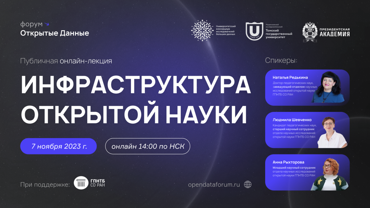 Научная библиотека Томского государственного университета и Государственная публичная научно-техническая библиотека Сибирского отделения Российской академии наук (ГПНТБ СО РАН) присоединились к форуму «Открытые данные – 2023» и проведут свои мероприятия, посвященные открытой науке и открытому доступу к информации. Лекция «Инфраструктура открытой науки» будет мероприятием-сателлитом и пройдет до начала Форума. Паблик-ток «Данные для открытой науки» станет одним из основных мероприятий Форума и состоится в рамках ДАТА-ТЕХ: как извлекать из данных пользу.