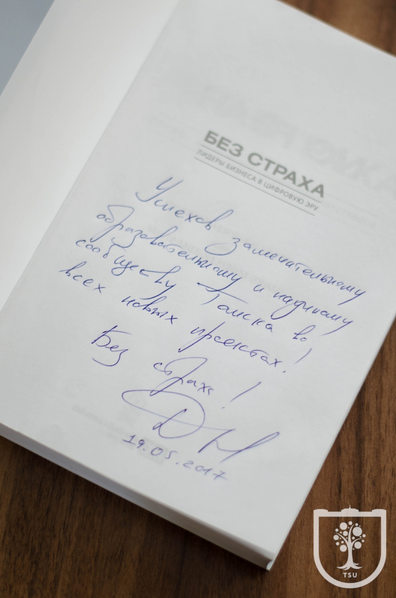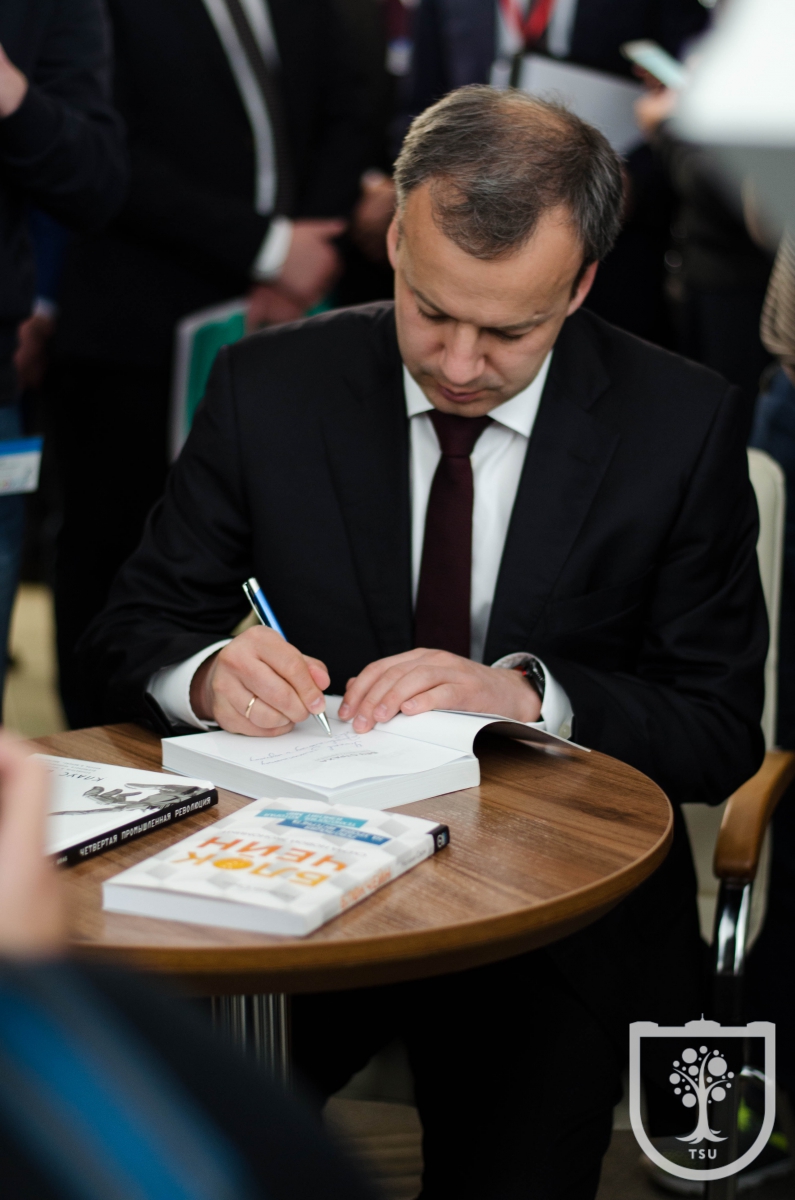 19 мая в рамках работы форума молодых ученых U-NOVUS заместитель главы правительства РФ Аркадий Дворкович принял участие в открытии нового корпуса Томского государственного университета на Набережной реки Ушайки. Здесь разместился Институт экономики и менеджмента, который призван стать центром компетенций мирового класса в области экономического развития. В помощь будущим специалистам в корпусе организована библиотека. Аркадий Дворкович посетил её и подарил книги Мелани Свон «Блокчейн. Смена новой экономики», Клауса Шваба «Четвертая промышленная революция», а также книгу П. Вильякайнена «Без страха: лидеры бизнеса в цифровую эру», в создании которой принимал участие в качестве российского эксперта.
