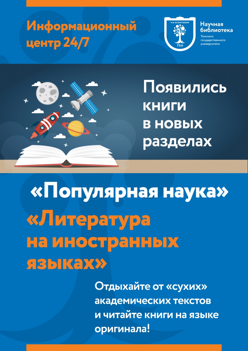 Книги в новых разделах доступны круглосуточно. Информационный центр 24/7 располагается на 1-м этаже нового здания Научной библиотеки ТГУ. Консультанты помогут определиться с выбором книг и ответят на вопросы.
