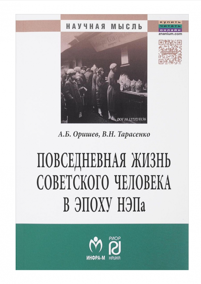 Оришев А.Б., Тарасенко В.Н. Повседневная жизнь советского человека в эпоху НЭПа : историографический анализ : Монография. – М. ; РИОР : ИНФРА-М, 2017. – 148 с. – (Научная мысль). URL: http://znanium.com/bookread2.php?book=757919