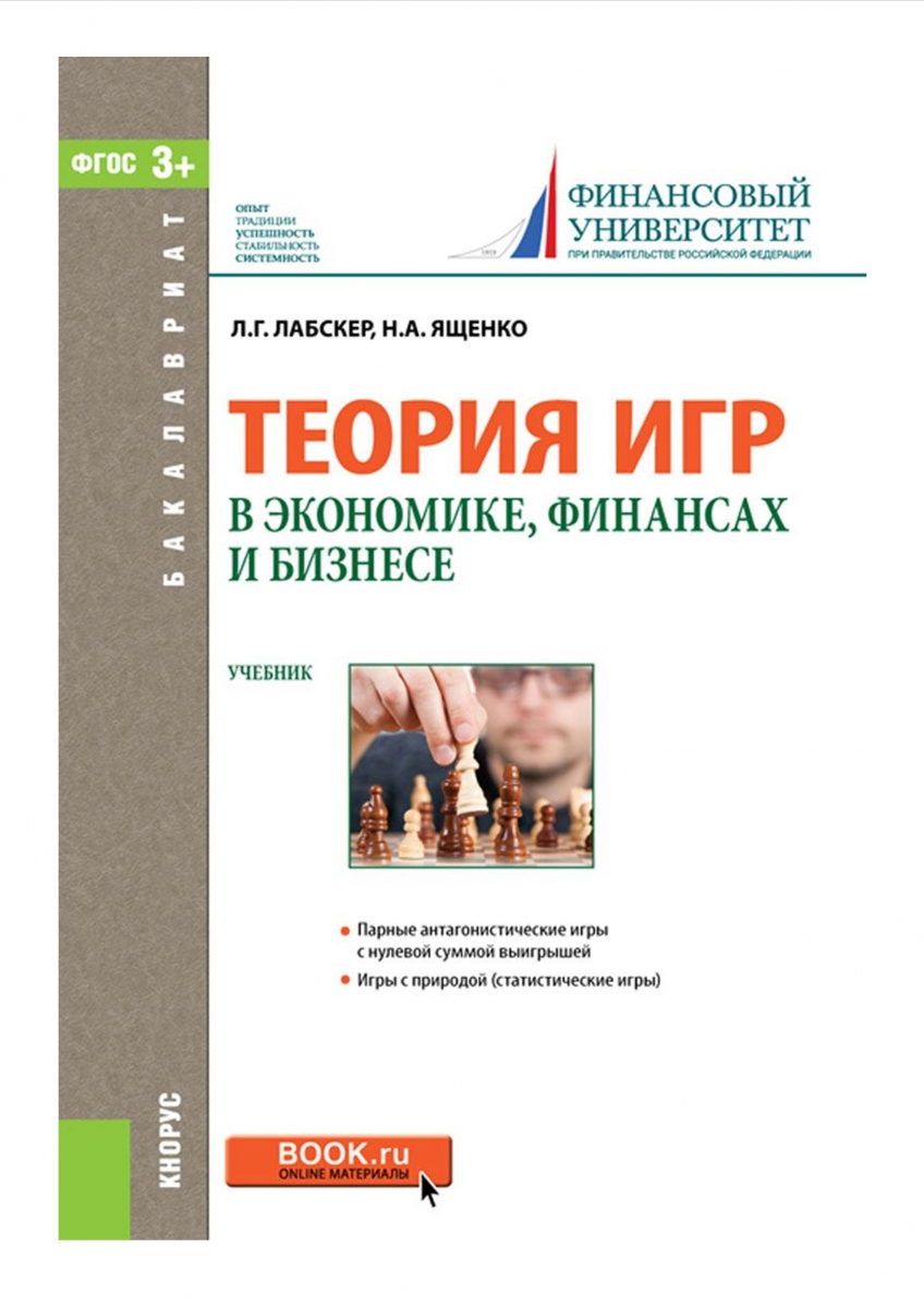 Лабскер Л.Г. Теория игр в экономике, финансах и бизнесе : учебник / Л. Г. Лабскер, Н. А. Ященко ; под ред. Л. Г. Лабскера. – М. : Кнорус, 2017. – 526 с. – (Бакалавриат).