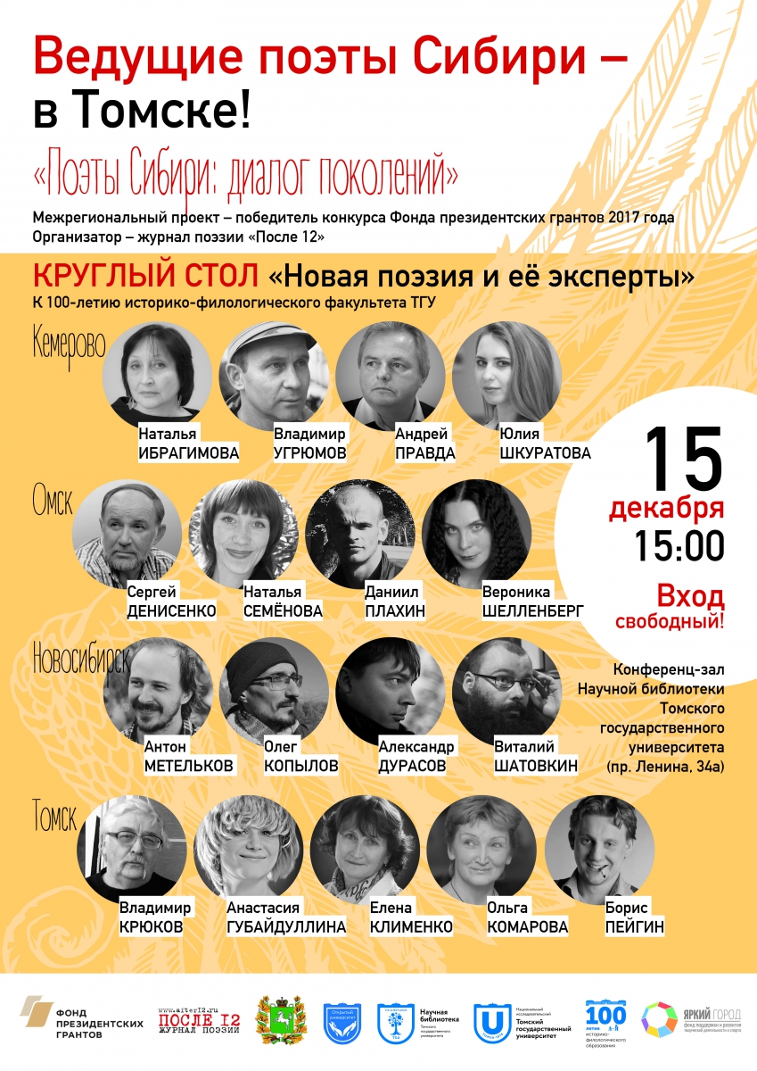 15 декабря с 15:00 до 16:30 в конференц-зале Научной библиотеки ТГУ пройдёт круглый стол «Новая поэзия и её эксперты», где поэты, филологи и просто увлечённые литературой томичи  будут размышлять об особенностях современного поэтического слова, о взаимоотношениях автора и читателя.