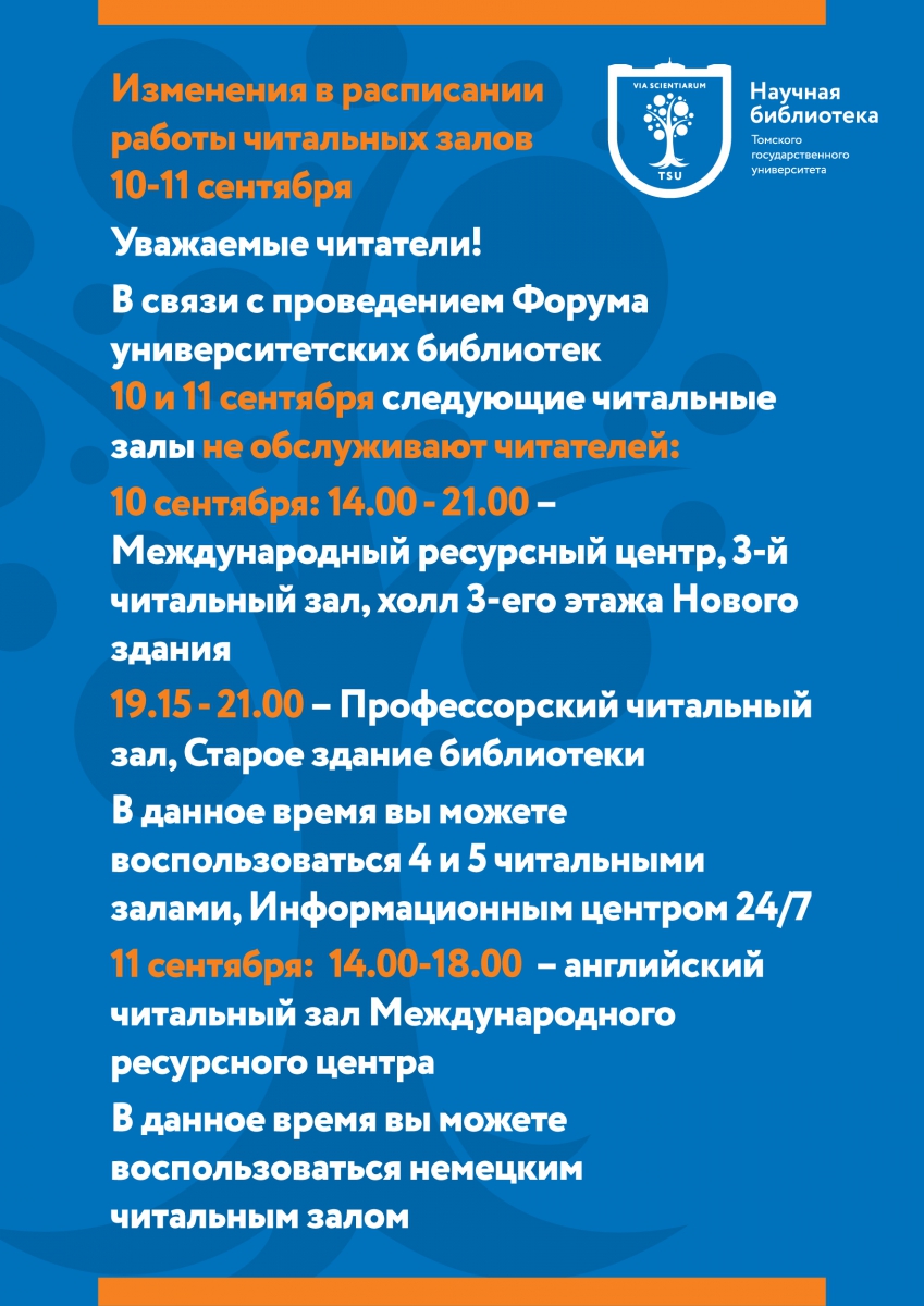 Изменения в расписании работы читальных залов 10 - 11 сентября