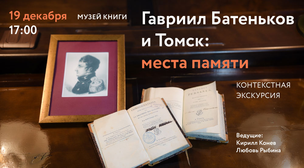 На контекстной экскурсии проследим вехи жизни Гавриила Батенькова, рассмотрим историю реконструкции и изучения его личной библиотеки, познакомимся с некоторыми принадлежавшими ему книгами, которые ныне хранятся в фонде Научной библиотеки, а также обсудим, как память о декабристе вписана в городское пространство Томска.