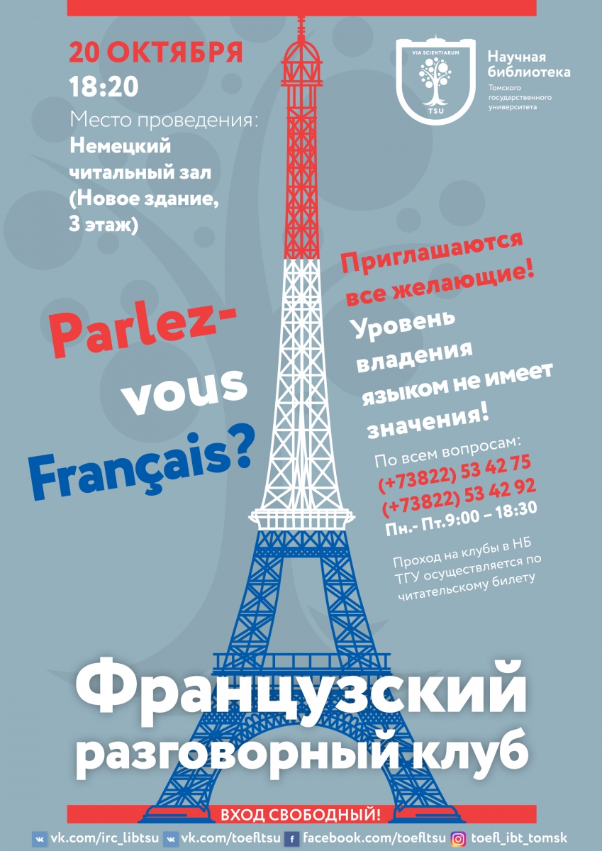 20 октября в 18:20 клуб разговорного французского приглашает на встречу в немецкий читальный зал.