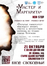 Чтение романа Михаила Булгакова «Мастер и Маргарита» в режиме нон-стоп начнется 21 октября в 10:00 в конференц-зале Научной библиотеки и продолжится до тех пор, пока участники не прочтут последнюю строку романа. Каждый сможет подключиться к марафону в любое время и прочитать небольшой отрывок из романа вслух. Предварительная регистрация на мероприятие не нужна.