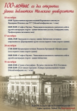 В начале октября исполнилось сто лет со дня открытия здания библиотеки Томского университета для читателей. Сегодня старое здание Научной библиотеки ТГУ является памятником архитектуры федерального значения. Оно строилось в 1912-1914 гг. по проекту архитектора Андрея Крячкова - автора целого комплекса зданий в Университетской роще. Здание библиотеки стало главной достопримечательностью не только в этом комплексе, но и во всем архитектурном облике Томска начала ХХ века. 3 октября 2014 г. состоялось торжественное открытие памятной доски на фасаде библиотеки, а в течение всего октября в библиотеке будут проходить праздничные мероприятия.