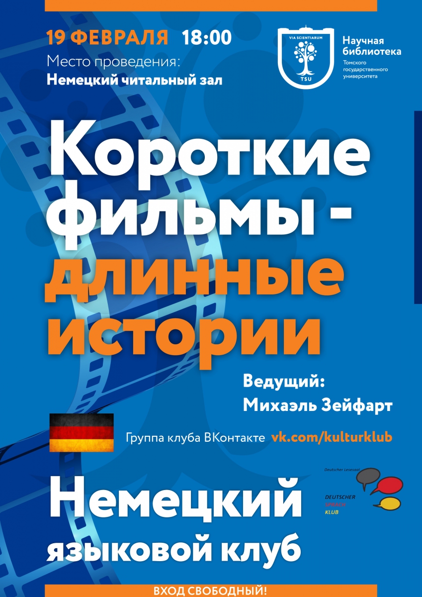 Немецкий читальный зал Международного ресурсного центра приглашает всех желающих на очередную встречу немецкого языкового клуба под руководством преподавателя из Германии, лектора DAAD Михаэля Зейфарта. Участники смогут просмотреть короткометражные немецкие фильмы и обсудить один из них, выполнить занимательные задания, связанные с темой встречи, и получить призы, а также свободно пообщаться за чашечкой чая.