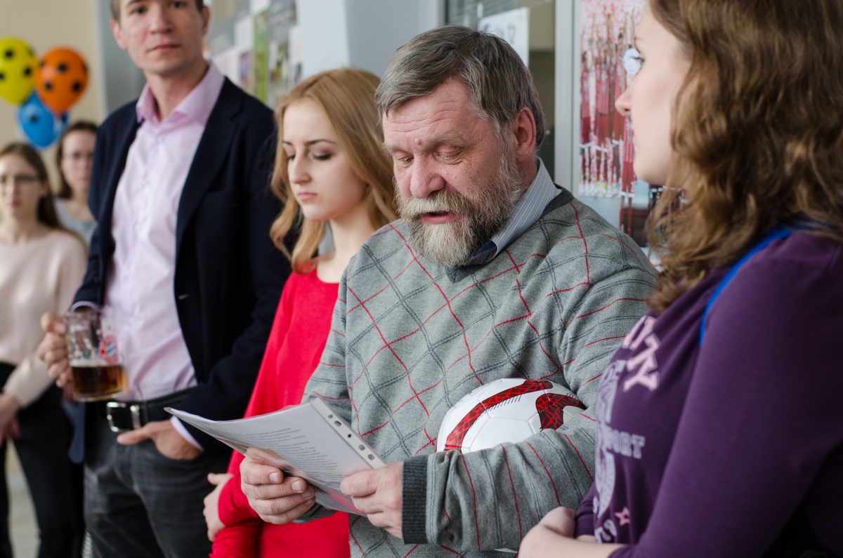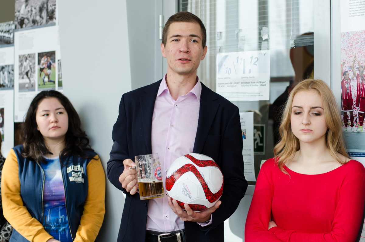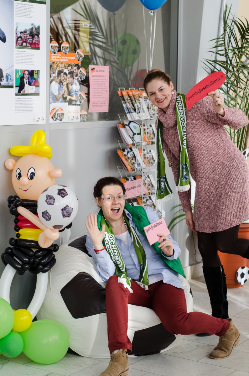 Затем волонтёры центра «UNIVOL» увлекли гостей в своеобразное путешествие по истории немецкого футбола, следуя от одного плаката к другому. Экскурсанты не остались пассивными слушателями – начался подвижный интерактив на футбольную тему. Так были проверены знания и готовность любителей футбола к наступающему чемпионату мира, до которого остаются считанные месяцы. Кроме этого, задания носили и тренировочный характер для тех, кто изучает немецкий язык: по фамилиям спортсменов Германии и матчам были созданы скороговорки. Гости соревновались, читая их на скорость, и получали призы.