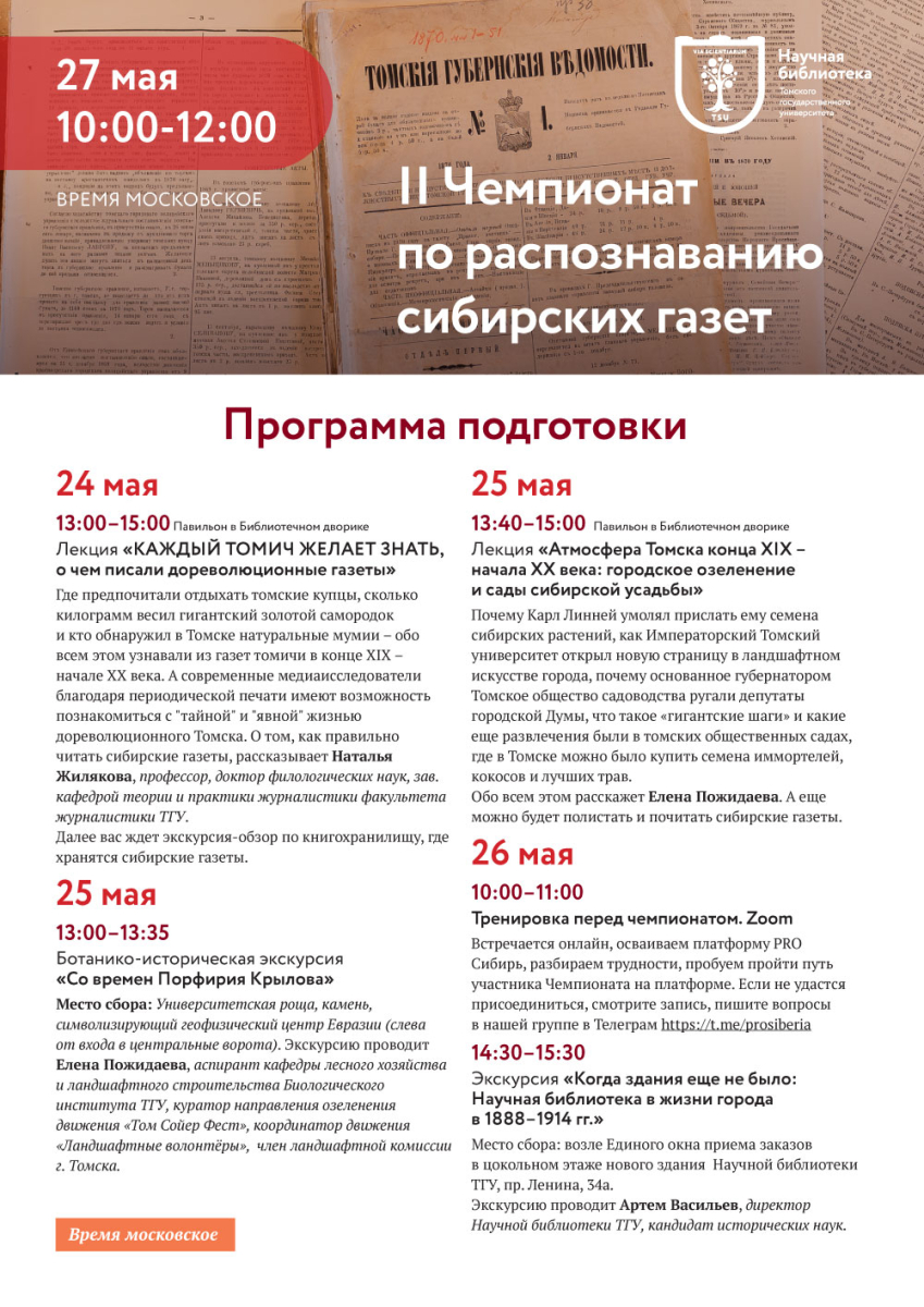 – В этом году мы впервые проведем серию подготовительных событий к Чемпионату, чтобы почувствовать атмосферу того времени. 24–25 мая будут лекции, экскурсии, где можно будет увидеть и взять в руки сибирские газеты рубежа веков. Накануне Чемпионата, 26 мая, пройдет тренировка, когда можно попробовать поработать на платформе «PRO Сибирь», потренироваться в редактировании автоматически распознанного текста, примерить на себя новую роль участника Чемпионата, задать вопросы организаторам. В завершении дня состоится эксклюзивная экскурсия от директора Научной библиотеки, – добавил Андрей Пархоменко.