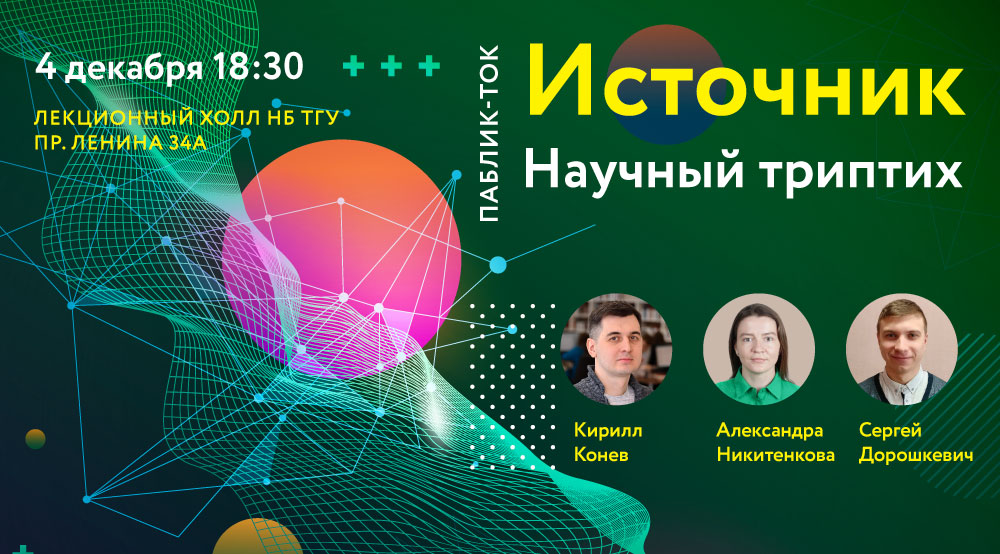 Паблик-ток «Источник. Научный триптих» начнется 4 декабря в 18:30 в лекционном холле Научной библиотеки ТГУ. Молодые ученые представят значимое явление нашей жизни с точки зрения разных наук, а также поделятся мнениями о любимых книгах. В центре внимания второго триптиха – феномен «Источник» в истории, геологии и электрофизике. Этот совместный просветительский проект Научной библиотеки ТГУ и Совета молодых ученых Томской области стартовал в феврале нынешнего года.