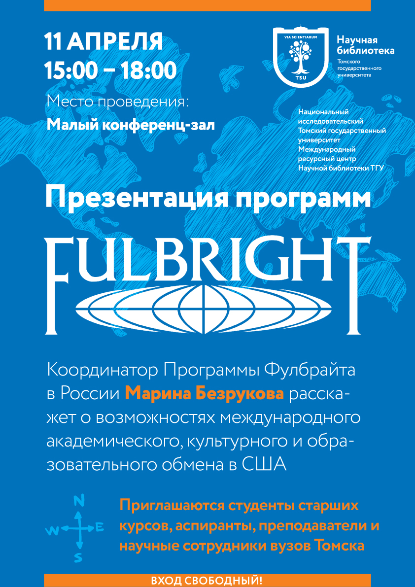 Национальный исследовательский Томский государственный университет и Международный ресурсный центр Научной библиотеки ТГУ приглашают на презентацию грантов Программы Фулбрайта в России.