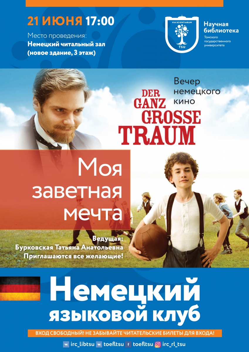 21 июня 2018 г. в немецком читальном зале Международного ресурсного центра состоится вечер немецкого кино. В этот раз мы посмотрим фильм «Моя заветная мечта» («Der ganz große Traum») режиссёра Себастьяна Гроблера, снятый по мотивам жизни Конрада Коха – популяризаторa футбола в Германии.