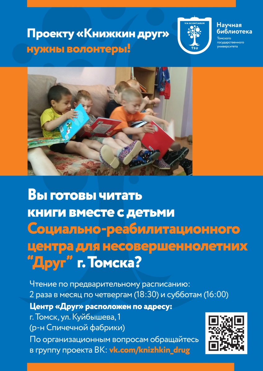Напоминаем, что книги для проекта "Книжкин друг" можно приносить в Научную библиотеку ТГУ: пр. Ленина, 34а, цокольный этаж нового здания, стеллаж с афишей проекта.