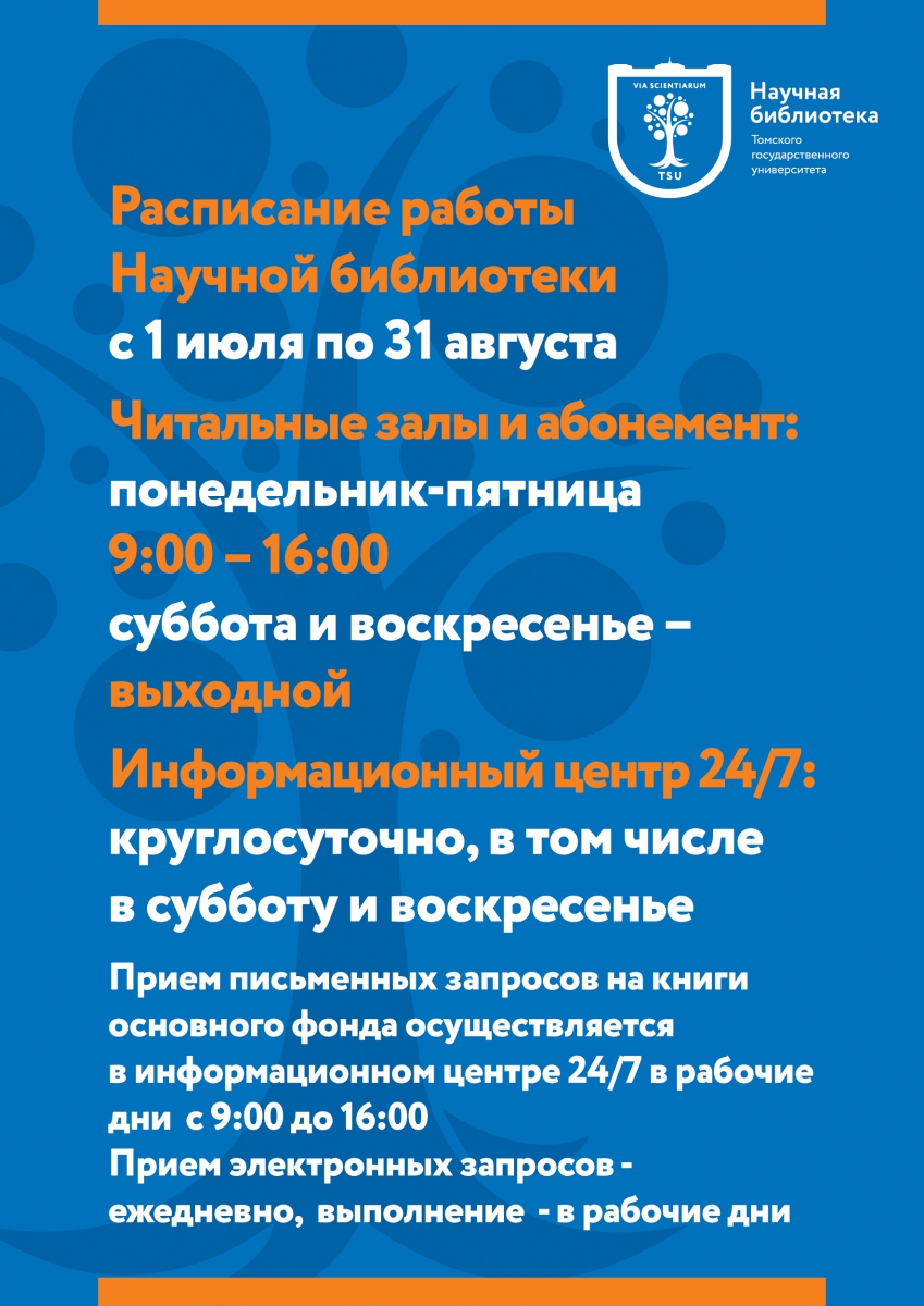 Расписание работы Научной библиотеки с 1 июля по 31 августа
