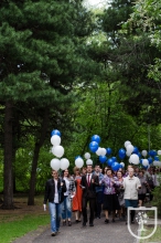 А затем праздник выплеснулся за стены библиотеки. Шествие по родным дорожкам университетской рощи завершилось у входа в Alma Mater – где начинался университет вместе со своей библиотекой. В честь этого единства в небо взлетели белые и голубые шары с нашей символикой.