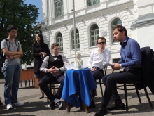 Книжный клуб Научной библиотеки 6 июня принял участие в проекте «Открытого университета» ТГУ – литературно-художественном фестивале «…Ваш Пушкин», посвященном празднованию дня рождения поэта и Дню русского языка. На одной из интерактивных площадок в Университетской роще члены клуба обсуждали творческие взаимоотношения А.С. Пушкина с «любомудрами» - литературно-философским кружком первой трети XIX века. Студенты первого курса исторического факультета Илья Хитров и Алексей Вирясов вместе с аспирантом ИФ Андреем Кузьминым, опираясь на письма Пушкина и его современников, воссоздали сложную историю основания журнала «Московский вестник» и публикации в его первом номере отрывка из пушкинской трагедии «Борис Годунов». В эту беседу были вовлечены и гости праздника.