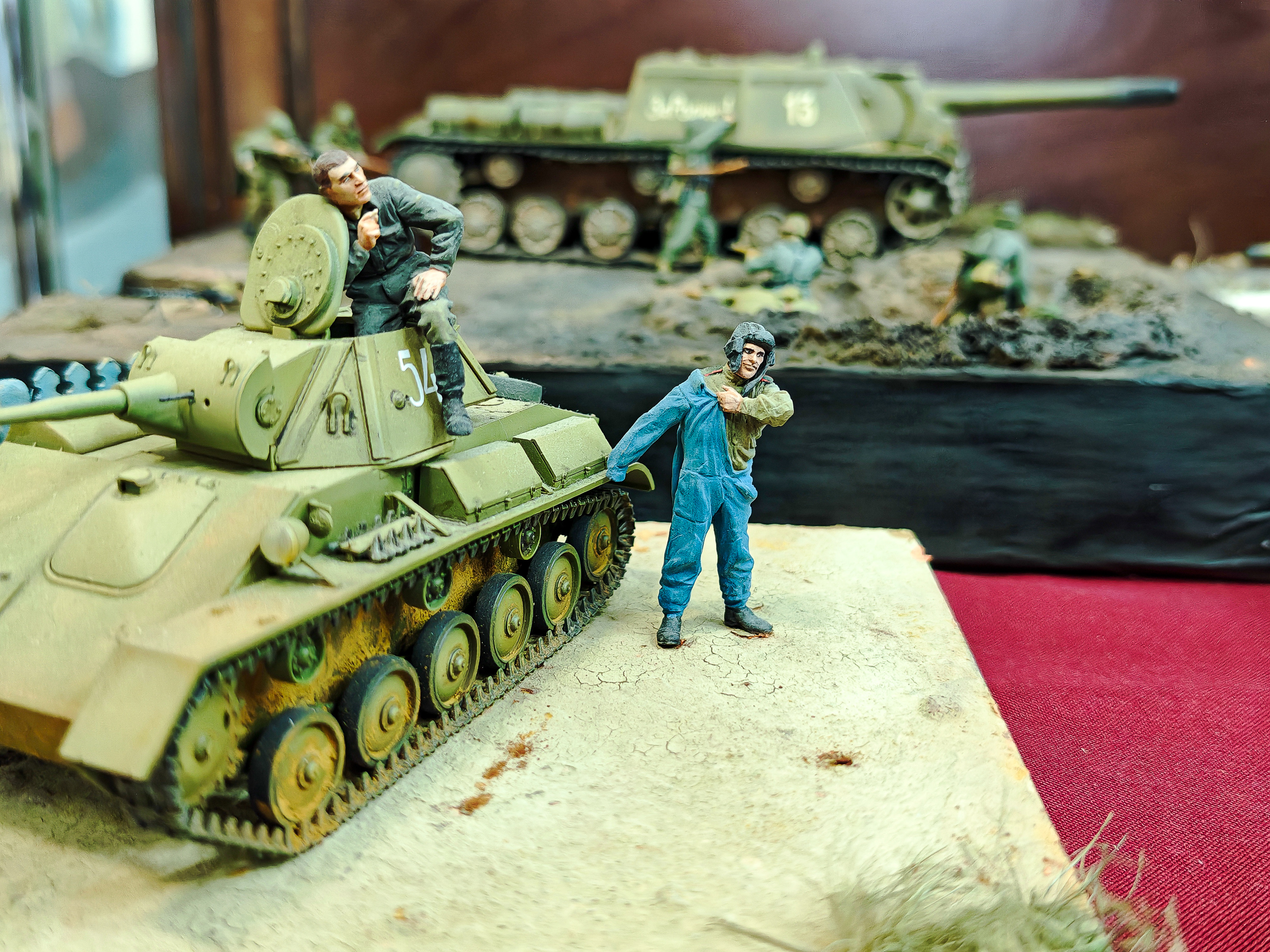 В одной из витрин выставки расположены масштабные модели техники и фрагменты диорам, изготовленные участниками клуба «Взлёт» Львом Луговским, Марком Харламовым, Матвеем и Елизаветой Бредихиными.